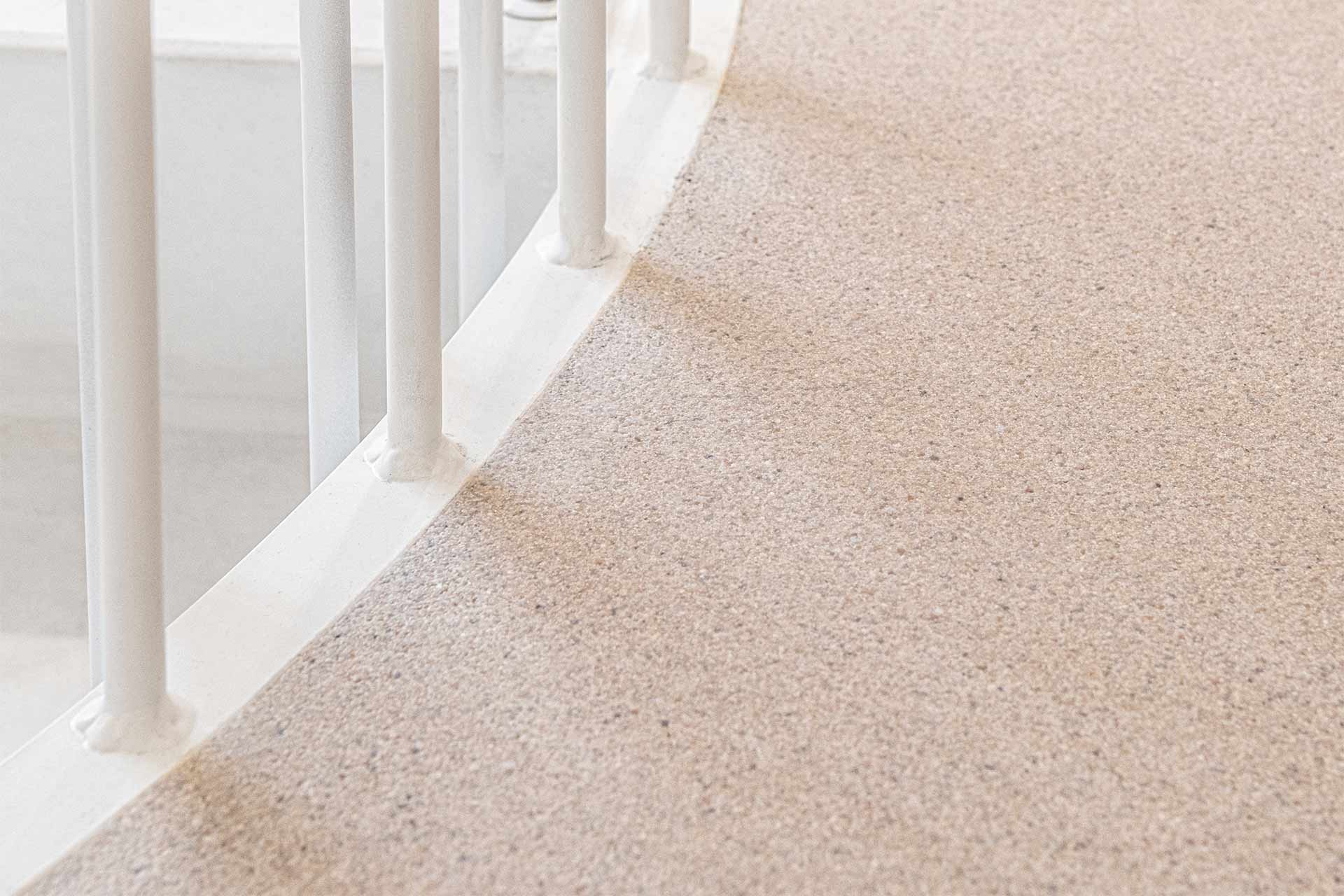 La couleur du sol devait rester stable malgré la forte incidence de la lumière extérieure, il était donc important d’utiliser des matériaux de revêtement résistants au jaunissement. Grâce à son aspect minéral, le sable de quartz clair donne aux clients une impression accueillante dès qu’ils entrent.