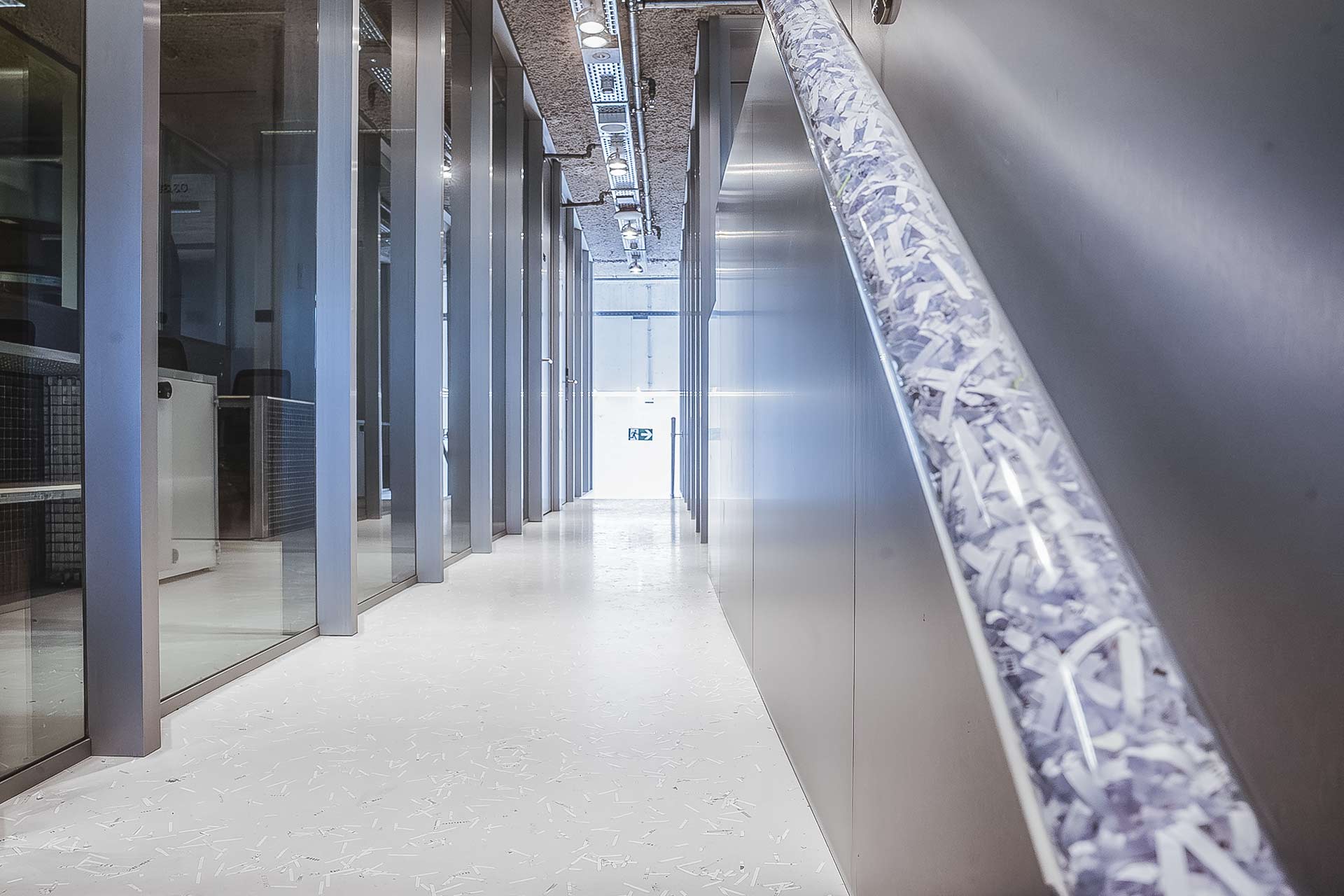 Une première couche de scellement a ensuite été appliquée avec KLB-SYSTEM POLYURETHAN PU 811 E. Sur le sol des couloirs, des bandes de papier ont été étalées sur le matériau fraîchement appliqué. Pour répéter le design, les mêmes rognures ont été insérées dans une main courante en verre creux. Dans la salle de réunion circulaire, des bouts de papier découpés à la perforatrice ont l’effet de confettis.