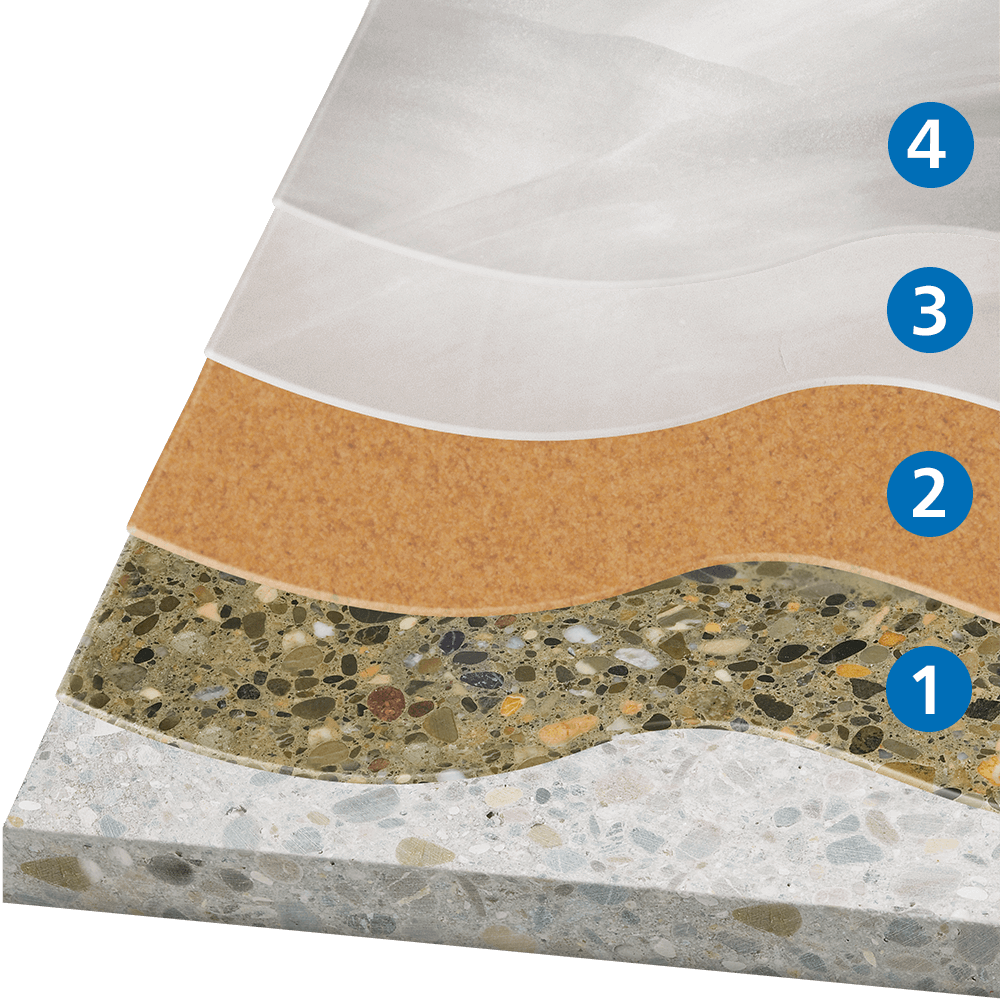Dies wird u.a. durch eine elastische trittschalldämmende Schicht erreicht, die ein komfortables Begehen bei gleichzeitig gelenkschonendem, gutem Laufgefühl ermöglicht.