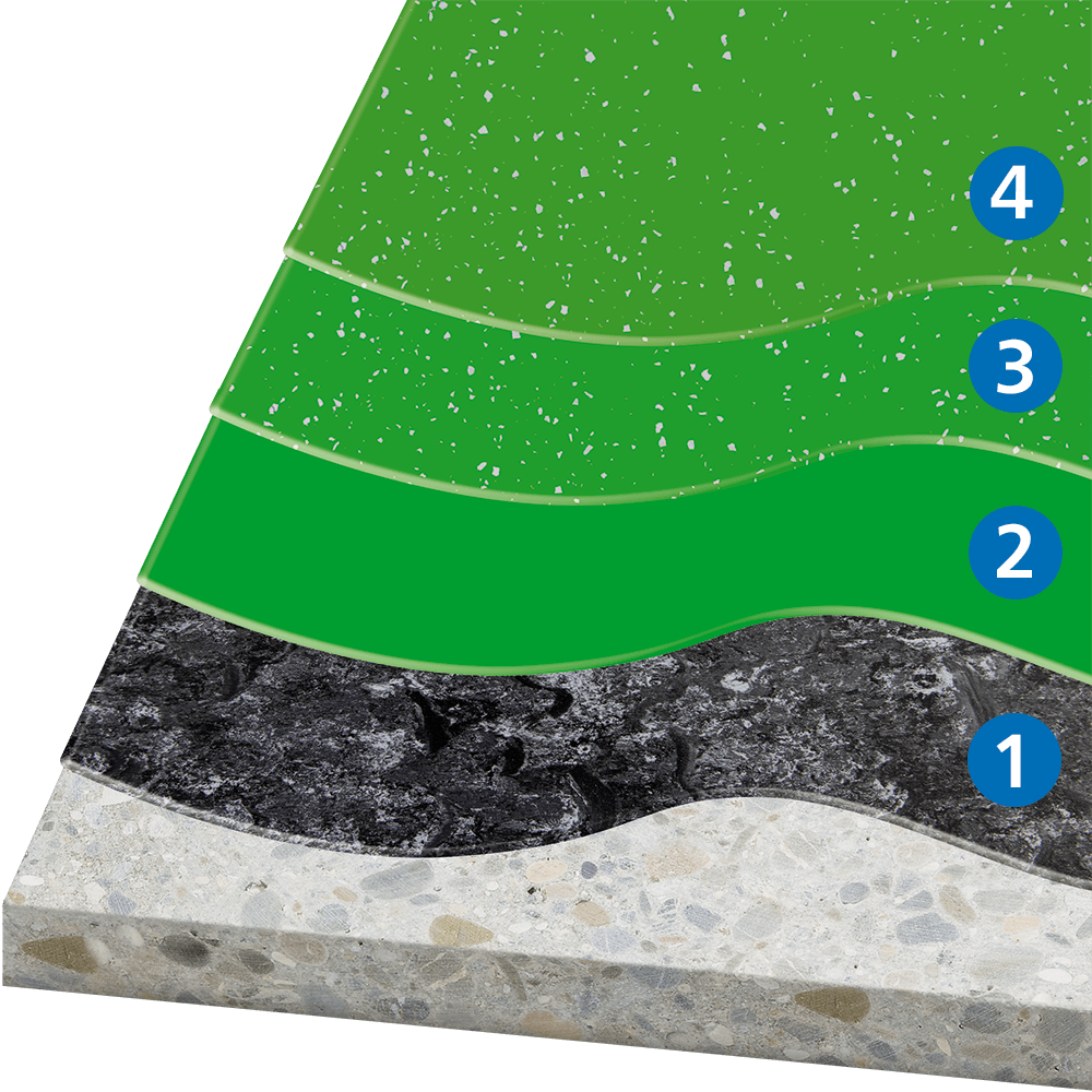 Unebenheiten und Druckstellen wurden egalisiert, anschließend erfolgte eine farbige Versiegelung mit dekorativer Chips-Einstreuung. Die abschließende 2K-PU-Versiegelung KLB FLOOR SEALER 100 Transparent erzeugt eine robuste, leicht zu reinigende Oberfläche und verlängert die Nutzungsdauer des Bodens.