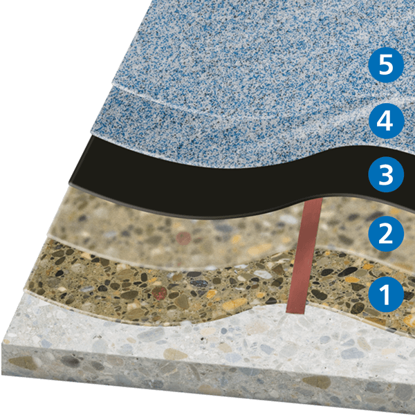 - Nivellierende Grundschicht mit KLB-SYSTEM EPOXID EP 50 und KLB-Mischsand 3/1, Vollabstreuung mit KLB-Quarzsand