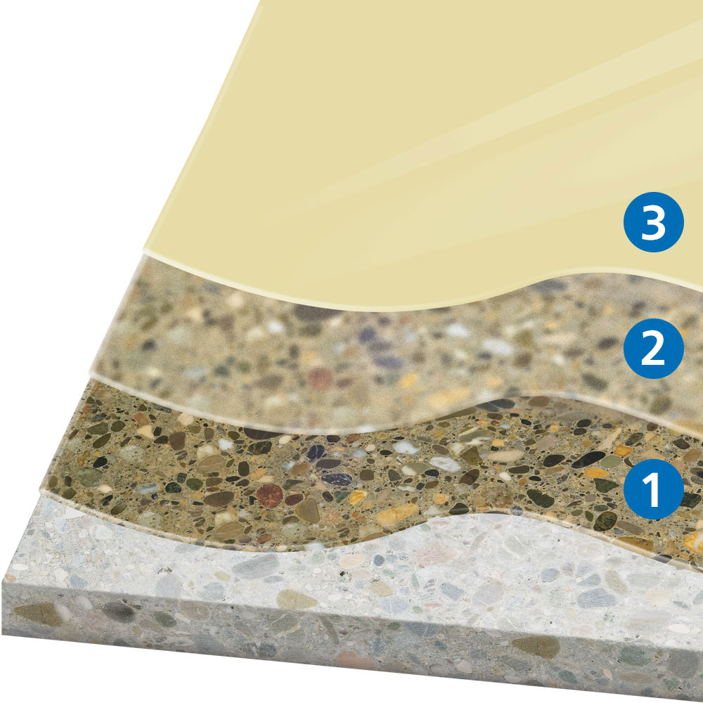 - Kratzspachtelung mit KLB-SYSTEM EPOXID EP 57 mit KLB-Mischsand 2/1, offene Abstreuung mit KLB-Quarzsand